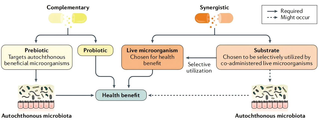 Synergistic Synbiotic-Mixture of a selectively utilized substrate and a live microbe chosen for its ability to deliver a health effect. Components comprising synergistic synbiotics work together to bring about resulting health benefit(s)[4].