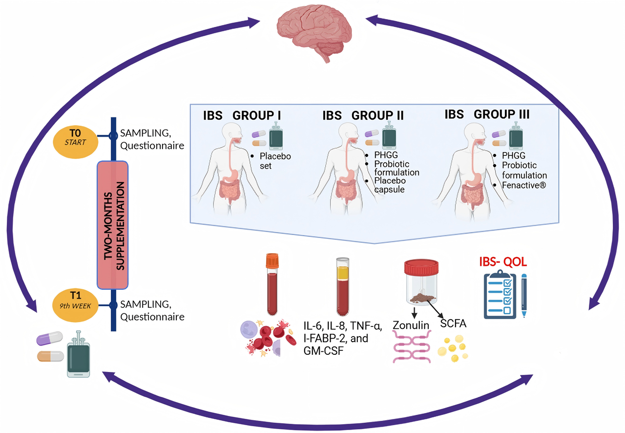 Treatment effects were evaluated using the IBS Quality of Life (IBS-QoL) questionnaire, serum inflammatory markers (including IL-6, IL-8, TNF-α), and fecal short-chain fatty acids (SCFAs) and zonulin measurements.