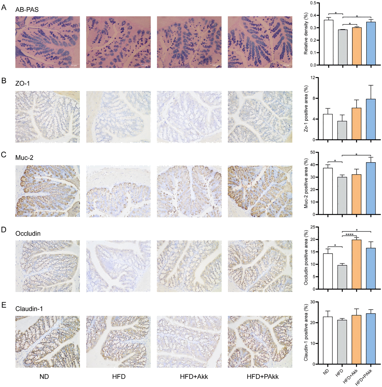 Figure 2. Akk11 enhances gut barrier. Effects of Akk11 on (A) the relative proportion of goblet cells for AB-PAS staining of the mouse colon; (B) ZO-1-positive area in the colon; (C) Muc-2-positive area in the colon; (D) Occludin-positive area in the colon; and (E) claudin-1-positive area in the colon. Sample size (n = 5/ group); p < 0.05, * p < 0.01, *** p < 0.001, and **** p < 0.0001 [3].